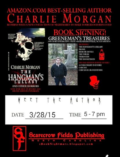FOR IMMEDIATE RELEASEMarch 23, 2015Greeneman’s treasures hosts Local best selling Horror Author, Charlie Morganfor his new book Launch and signing Hendersonville, NC, March 23, 2015– GreeneMan’s Treasures, located at 2000 Spartanburg Highway in Hendersonville, announces a rare Book Signing Event by WNC’s own Charlie Morgan on Saturday, March 28, 2015 from 5 -7 PM at our shop. Mr. Morgan will be signing books available for sale ($5.99) at the Event and on Amazon.com. All are welcome to come out and mix and mingle and meet the Author. Refreshments will be served.We at GreeneMan’s Treasures are so proud to present, our friend, Charlie Morgan with the much anticipated release of his latest published work, The Hangman’s Lullaby,” says Pattie Greene, Co-owner and Proprietor of GreeneMan’s Treasures.About the Author: Charlie Morgan, a WNC native, is an Amazon.com Best Selling Horror Author. He is a lifelong horror fan and cryptozoology enthusiast. For the past ten years he has also served as a fireman for Green River Fire and Rescue. Charlie is the author of numerous short stories and novellas, including the best sellers: Sticks and Stones, and A Cold Night in Fouke.“Slick Gothic Pulp with gusto that is fun and goes down smooth… Charlie Morgan captures the drudgery of small town life quite nicely.” - Chip Fehd of Buyzombie.comGreeneMan’s Treasures is a locally owned and operated Thrift Store featuring Antiques, Furniture and so much more, gratefully serving Henderson and surrounding counties for nearly 2 years. # # #If you would like more information about this topic, please contact Pattie Greene at 828-606-8834 or email at greenemanstreasures2013@yahoo.com.