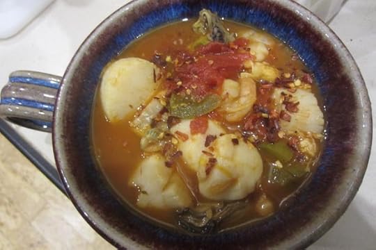 I knew the storm was coming so I prepared a fine winter repast— cioppino, the San Francisco treat— cod, prawns, scallops, oysters, and clams in a spicy tomato broth.