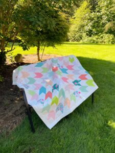 I decreased the block size to 5 inches, which gave me an approximately 44-inch square quilt with the borders. It’s the perfect size for this new little addition to our family. I still need to have it quilted, but it turned out to be really cute.