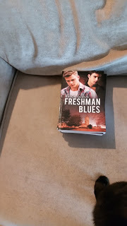My print copies arrived! (Try to ignore the cat foot).Release date for Freshman Blues is on the 3rd! I'll be hosting an event on the Dreamspinner blog on the 3rd, and then on the Dreamspinner FB page on the 7th, so stop by for a chance to win one of these free print copies!