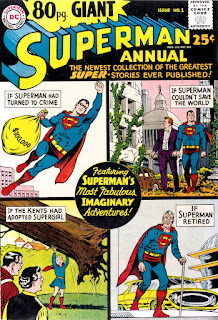 You would’ve been familiar with the 80-page Giant issues, which were priced 25 cents and compiled stories from the past and typically focused on a single theme. For example, I recall a Superman Giant issue whose stories focused on the different colors of kryptonite; a Jimmy Olsen Giant issue featured several of the strange transformations Superman’s pal had undergone over the years. (I won’t go into those changes, but you can click here for an article that describes 15 of those stories—and it’s absolutely appropriate that the word bonkers is in the essay title. Gregor Samsa never had so much fun, but Jimmy Olsen never experienced much existential angst before the reader reached the letters column.)