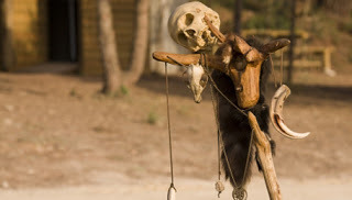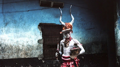 As the gloom of the jungle encircled him, he was compelled to remove his shades to find his way through the thick entanglement of thorns and stinging nettles. Every few metres, planted atop a stake in the ground, was a grinning skull, some human, some ape, with many more in the mud bearing only their remains. Then he came to a passageway some twenty metres long, which he had no choice but to stoop and enter, or else turn back. It was an indestructible edifice, constructed from timbers and twine, and tightly woven into a tunnel, with overhead loopholes through which an unwelcome intruder could be speared. Inside the walls glistened with blood, and his way through was impeded by the stench as much as the confined space. When at last he emerged gagging at the other end he found a group of men in a smoky clearing, around a cache of weapons, and wearing caps of colobus monkey and antelope skin. Their greeting was unspoken, as they preferred to engage in a wordless standoff of cocksure postures and cold stares, enhanced by their weird surroundings as much as their attire.