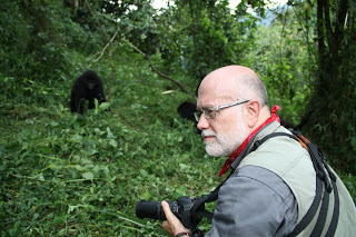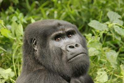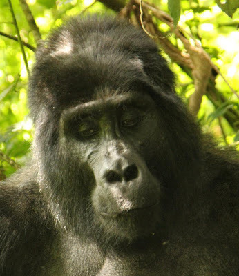 Safari, the former silverback of Nkuringo Over the course of the next hour, as we tiptoed through the springy foliage beneath the Giant yellow mulberry trees, we saw all fourteen gorillas in the group. Like monks in an ashram they needed to be sought out in their ferny hideaways. The last gorilla we encountered was the sage old silverback Safari, who had run the group for fifteen years before relinquishing leadership to the incumbent Rafiki. I was told he did not give up willingly, but put up a bold struggle that lasted for days. The fact that he was allowed to remain in his group was testament to their humanity. I know, we need a more encompassing word. Safari’s age, estimated at 40 years, had profoundly altered his appearance. His hair was long, chest limp, features sagging. Having lost all his teeth, he ate only soft young mulberry leaves, and there were deep dimples in his cheeks. He regarded us with tired, opaque eyes and a perspicacious gaze that spoke of a time when he alone used to keep the humans in line. I understood his pain. We'd both been brushed aside for younger blood, for the good of the gorillas. Whether as a consequence of apres-gorilla bliss or our ambassadorial trek, but as we started back up the ridge I came to the realisation that I too was an ambassador...to the gorillas. True, gorillas already have ambassadors from their own species, gallant individuals dispersed about the globe in zoos and institutions, who admirably represent their branch of the great ape tree. Koko, Snowflake, Bushman, and Samson swing to mind. In the wild their diplomatic corps seems wholly staffed by mountain gorillas, stars of the silver screen and countless wildlife documentaries, watched by hundreds of millions of people around the world. But a well-protected minority sub-species made up of less than 0.007% of Africa’s total gorilla population is hardly representative. What about the rest of them? If we are to consider the entire range of the two gorilla species, Gorilla gorilla and Gorilla beringei, we find a diverse ape federation stretching from the Bight of Bonny to the Albertine Rift Valley, encompassing ten African countries and four gorilla sub-species on either side of the Congo Basin. But Gorillaland’s in trouble. Because of a lack of resources, gorilla populations are dwindling. “Time to step up,” I thought, breathlessly struggling to lift myself on to the next ledge. Once there, I turned to gauge our progress against Nkuringo hill. We remained below it’s summit. Above us, dark clouds were gathering and the wind began to blow. We had so far been spared Bwindi’s infamous weather, but it looked as though things were about to take a turn for the worse. to be continued ...