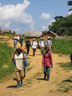 The next morning, after a hearty breakfast of Spanish omelets and boiled potatoes, we all piled into the back of a pick-up truck and drove out of Walikale Town. No one knew quite what to expect. But we didn't think our first surprise would come so soon. After just twelve kilometers, the road completely disintegrated, forcing us to abandon our vehicle. In the confines of the equatorial forest the temperature was a sultry 35º Celsius, and it was stifling and windless.