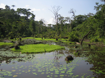 I’m in the middle of the jungle, but the sound of the forest is completely imperceptible. It's being drowned out by the din of a dozen transistor radios playing half a dozen different rhumbas, over the chatter of young men bragging and old men haranguing, and the shrill laughter of prostitutes resounding through the high canopy, like the cries of mating tree hyraxes. Smoke pervades everything; there's no shortage of fuelwood.