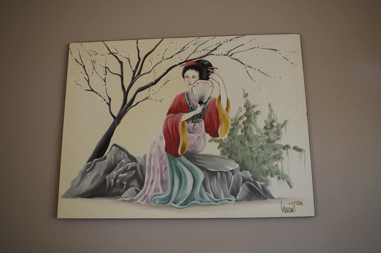 Between the end of the orchids painting and the Japanese lady there is enough for my feet to go up against, hands down finding balance, feeling the tremor of what it means to have the whole body on them.