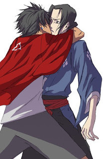 They stumbled back to Mugen's room, holding each other up. Mugen still trying to make some point as his feet kept tangling in Jin's. Jin caught Mugen as he fell and slammed into the wall under the other man's weight. They stood there for a moment with Mugen leaning into him, breathing unsteadily into Jin's ear. The other man's breath tickled his ear and sent a shiver down his spine. With a lurch, Jin thrust the drunk back on his feet and set them both in motion again.