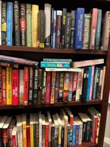 When we downsized a few years ago, I donated my personal library to a rural library that had a wonderful building but no money for a collection. I only kept three or four bookcases of children’s books for my then upcoming grandchildren and another for my cookbook collection (yes, the woman who doesn’t cook collects cookbooks). The biggest bookcase we moved housed my TBR collection. As I write this, TBRs are piled on my desk, my dresser, and an old fashioned telephone table.