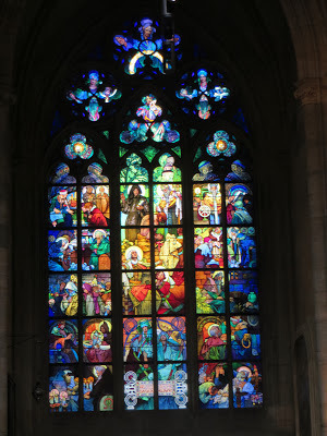 Prague Castle!For years, I wanted to go to Prague. One of my favorite artists, Alphonse Mucha (who designed the window below), is from Prague. Ever since some chick told me about a bunch of great Mucha exhibits she saw in Prague, I've wanted to go there and do that. That made Prague a definite plot point in my trip. Besides, I'd seen pictures. I knew it was an un-bombed masterpiece of a city. Before I ever got there, I knew I was in grave danger of falling in love with the city.