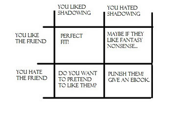 So here's my Christmas gift to the blog: until Christmas I am offering Shadowing at Smashwords for the freeness of zero dollars with code QQ54E for zero dollars. The nice thing about Smashwords is that you can download a book in any format, from PDF to ebup to mobi. Just make sure you enter in the code so you don't accidentally pay me money or something. (That would kill the Christmas spirit. And I don't want anyone unhappy during the holidays. Now the rest of the time...)Perhaps you don't realize why this free of freeness is a magical development. Allow me to explain: