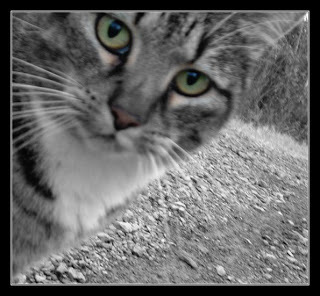 It isn't a good day without a few condescending glares from the cat. But truth be told, we've been friends for a long time. About ten years ago she walked up to my neighbor's house and got their attention. She and about five kittens had been abandoned somewhere. Carrying the kittens, one by one, she brought them through the woods, across the fields, hiding them under shrubs to keep them safe. When she determined the neighbors could be trusted, she trotted out the kittens. The neighbors called her Mom, and kept her, though the kittens ended up elsewhere.For years, she was a terror to rabbits and birds in the big field, but to me she was sweet and neighborly. Whenever I went for walks and found myself before the neighbor's house, this cat would trot down the driveway, and demand a pet. After much purring, she would start rolling around in the gravel, and I could make an escape to finish the walk.