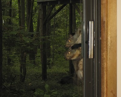 whisperwhisperBREADwhisperwhisperThis is what I get for sitting in front ofwindows. They know the food is inside, and they're starting tomobilize. I have seen single scouts scaling the door before, but this is the first time I've seen coordinated motion. In fact, I have never seen squirrels so close together without one chasing the other off.