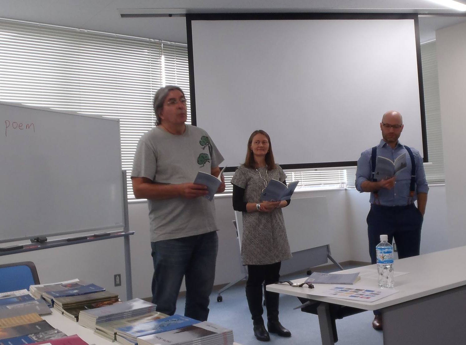 "Each of the narrators in Snow Bones lives through his or her daily life experiencing the transience of its moments. Their inner worlds leak through their monologues -- and yet we never really know who they are."At the Japan Writers Conference, Isobar Press publisher Paul Rossiter, Isobar poet Christopher Simons, and I each read one of the voices in the 3-voice haiku sequence "Countryside." While the sequences in the book are not presented on the page as alternating voices, we opted to read the haiku in turns--a haiku from the first voice, then one from the second, then one from the third--alternating all the way through in a sort of dramatic reading.