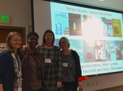 At the two-day conference for writers of all genres and styles, I attended sessions on crafting short stories, academic writing, mysteries, and short poems, a panel on getting ideas for fiction, and a session on Japan and Young Readers. I also presented two sessions: one on verse novels and the other a narrative poetry workshop.