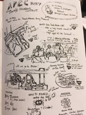 In May, I had the good fortune to attend the 2017 Asian Festival of Children's Content (AFCC--held May 17-21) in Singapore. Prior to the conference I served as Retreat Director for the AFCC Writers and Illustrators Retreat (May 13-16), held every other year. On May 13 the selected writer and illustrator participants, the retreat facilitators--myself, author Holly Thompson; editor Sayoni Basu of Duckbill Books, illustrator Amy Ng, plus Premadevi Perumal of the National Book Development Council of Singapore, gathered and boarded a ferry from Singapore to Bintan Island, Indonesia, then bused a short distance to the Angsana Bintan Resort--this was our lovely base for our creative endeavors over the next four days.