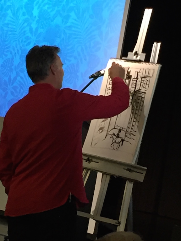 At the end of the panel of illustrators that included Roger Mello, Francois Place, Lisbeth Zwerger and was moderated by Paul O. Zelinsky, Francois Place (illustrator of the book about Hokusai The Old Man Mad About Drawing) did a bit of on-the-spot drawing.