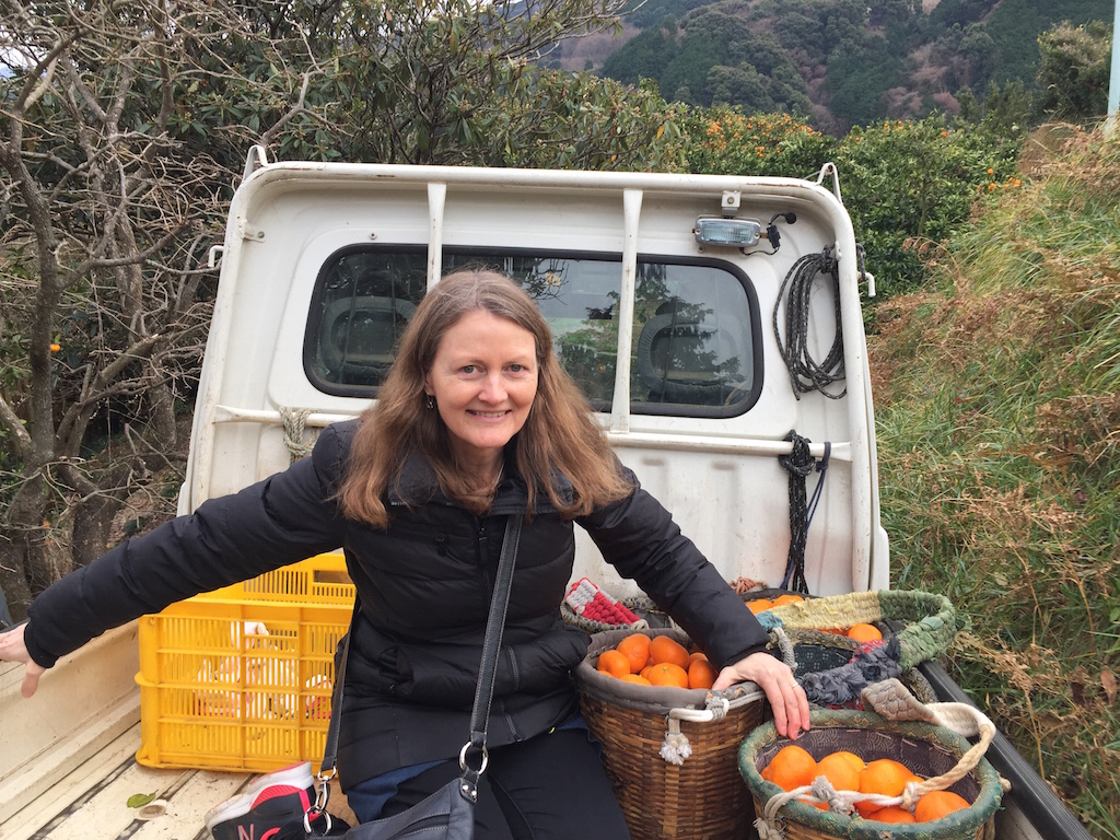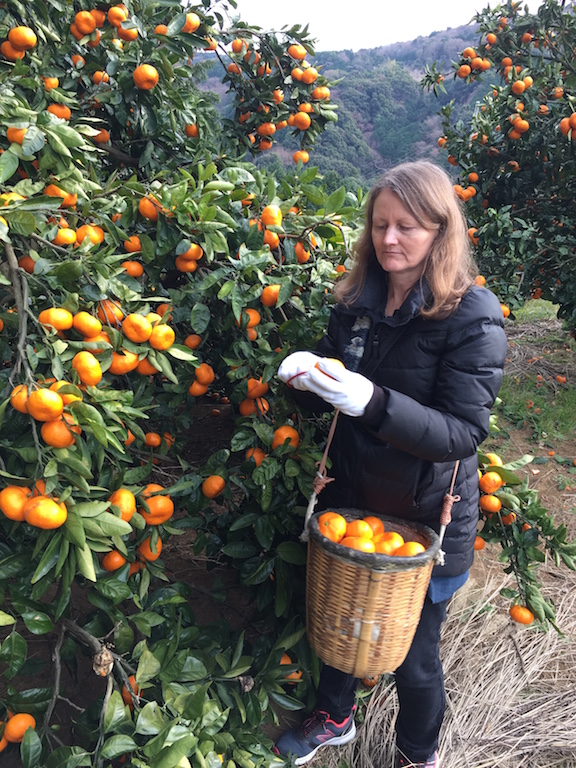 So our little group popped into his truck and rode up the steep slopes to one of his orchards and picked baskets full of mikan.