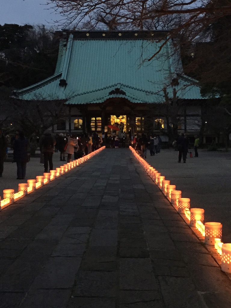 On this eve of the fifth anniversary of the March 11, 2011 Great East Japan Earthquake and Tsunami, one of our local temples here in Kamakura held a Buddhist Lantern Festival/Ceremony (万灯会) at dusk. People from the surrounding neighborhoods arrived as darkness settled, wrote messages of hope on the cups holding the candles, then gathered inside the temple's main hall for a Buddhist ceremony, prayers and incense lighting in memory of those lost and in hopes for recovery, good fortune, and revival in the areas of Tohoku affected.