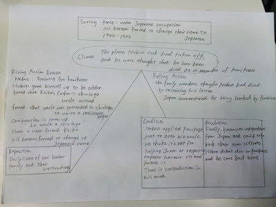 Plot diagram for When My Name Was Keoko by Linda Sue ParkStudents will soon be sharing their novel reflections with me digitally, and after the New Year break, during the flash fiction unit, they will be sharing an original flash fiction story with me digitally. Otherwise, thanks to a substitute instructor, the literature circles for novels have been carried out with little technology. Literature circles are quite magical. Groups of non-native English speakers taking full control of discussions of books they selected themselves and actively analyzing, questioning, interpreting and critiquing is wonderful to witness. The Japanese professor covering my classes witnessed this literature circle magic and commented, "It was inspiring to learn from your methodology. I have to learn from you how you have successfully inspired the students to participate in the class so actively."