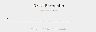 Since we had a limited amount of time for this lesson, some of the branches created by our class groups and pairs were incomplete or redundant, so I combined some branches and added some missing endings. The resulting story "Disco Encounter" below is a compilation of the many branches that students and I wrote--making it a completely collaborative project. It's a bit rough, and there are sections that definitely needed more proofreading, but the process was far more important than the product in this exercise.Click Disco Encounter to read the class story created with Twinery.org. (Press RESTART, or refresh to reload, and start the story again to try different branching options.)