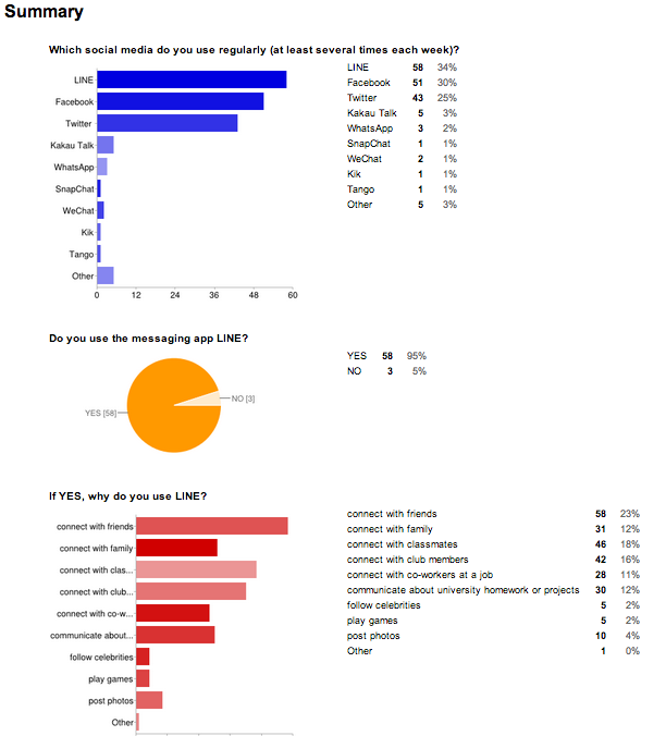 Of 61 student respondents, 58 use LINE. Most students use LINE as well as Facebook, and many use Twitter.