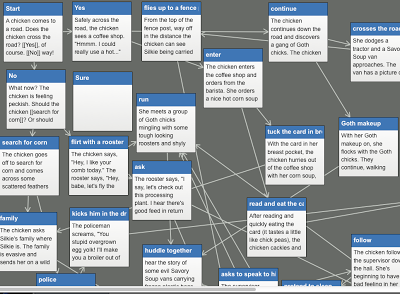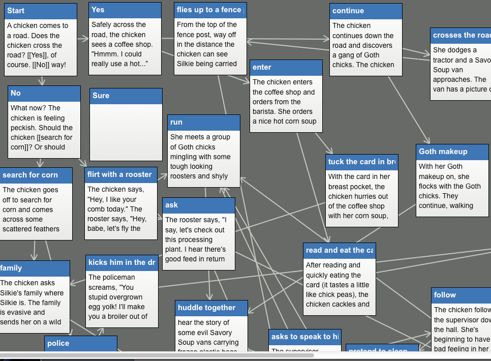 Though my university classrooms are not 1:1, I think that by using large sheets of paper and post-it notes in class for planning and mapping branches of the story in class, then uploading the results for the students to view, I can attempt a hybrid project of paper planning plus Twine upload for a group project in my creative writing class.