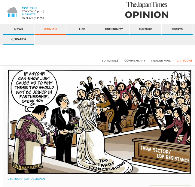 I'll then have the students examine additional cartoons from the Cagle site in pairs, and student pairs will present their cartoon and the analysis to the class. We'll also discuss this recent Dahl's Japan cartoon in the Japan Times about the TPP and tariff concessions.