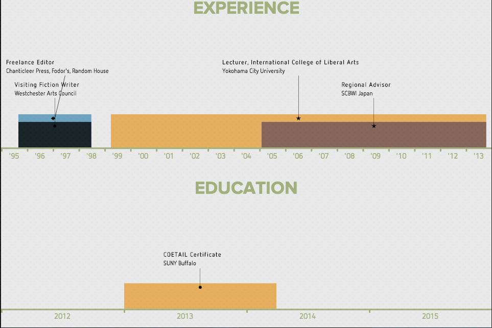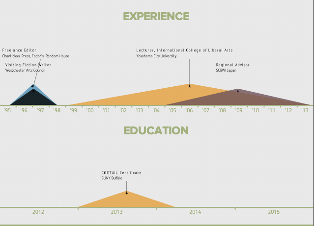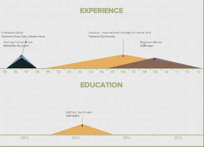 As I fiddled with these templates, I realized that creating an effective visual resume requires rethinking the resume entirely. Templates like those offered on Visualize.me might best be used as tools for creating a teaser resume, like a book or movie trailer, that serves as a lead in to a traditional resume.
