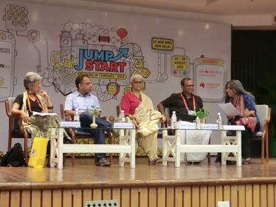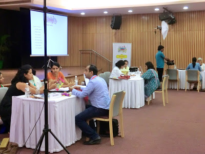 How some other folks start their dayJumpstart, as explained on the festival website, "has grown from two masterclasses for writers and illustrators in 2009 to a keenly anticipated annual gathering for any and everyone in the Indian children's book trade." This year's festival lasted two days, under the theme "Speaking in Tongues." Day 1 included four panel discussions: The Great Language Debate featuring diverging views on language; The Language Playground which centered on nonsense writing; Art as Language, Designer as Author featuring illustrators and designers; and Speaking in Tongues with four translators.