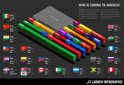 from Good InfographicsThese Washington Post infographics on the state of immigration in the U.S. may actually be helpful for discussing matters of politics and terminology, since in these visuals Mexican immigrants are not included in the data for North American immigration to the U.S., but rather in the data for Latin American immigrants.