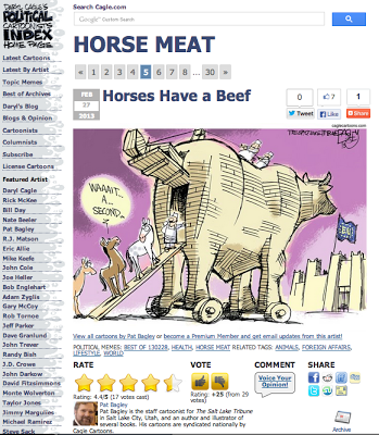 I updated my Political Cartoon plans recently. First we will examine and analyze a cartoon together that I'll project on the screen (only one computer in this classroom). We'll open with this cartoon from the 2013 trending topic "Horse Meat" by U.S. cartoonist Pete Bagley about the recent horse meat scandal in Europe.