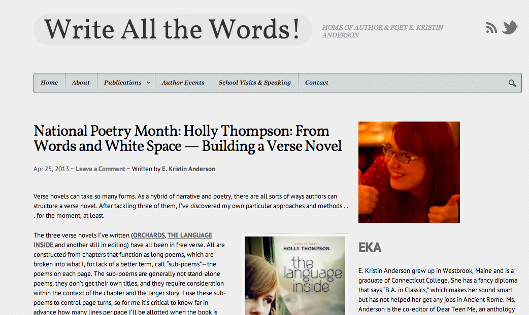 April is National Poetry Month in the U.S. and this week I am a guest blogger on Write All the Words, online home of author and poet E. Kristin Anderson. Check out all the previous posts on this site--what a great collection of poetry posts!