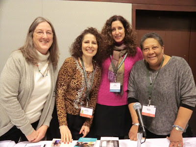 Helen Frost, Lesléa Newman, Meg Kearney, Marilyn NelsonOn Friday, authors Lesléa Newman, Marilyn Nelson, Meg Kearney and Helen Frost (Kwame Alexander was unable to attend) presented on "It Could Always Be Verse: Books in Verse for Young Adult and Middle Grade Readers." While not focused on verse novels per se, in that the works presented were not all fiction, these authors shared the journeys to some of their recent projects in verse--Helen Frost's formal structures in her new historical novel-in-poems Salt set in 1812 Indiana; Lesléa Newman on October Mourning, her collection of poems mourning the death of Matthew Shepard, and on the themed poems in I Remember: Hachiko Speaks; Marilyn Nelson (referred to aptly as a verse historian by one of her readers) on such works as A Wreath for Emmett Till and Carver: A Life in Poems; and Meg Kearney on her novel in poems The Girl in the Mirror. All of these panelists shared their enthusiasm for the use of poetic forms in their work, and noted that the bounds and restrictions of form seem to make the tackling of tough subjects bearable.