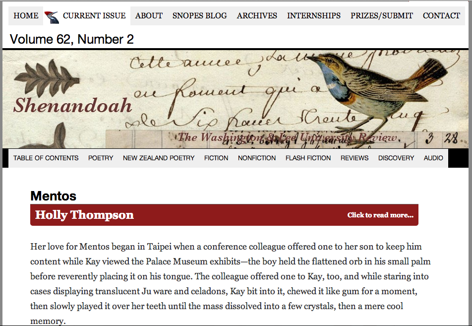 My flash fiction story "Mentos,"set in Taipei, Japan and New York, appears in Volume 62, Number 2 of Shenandoah literary review.