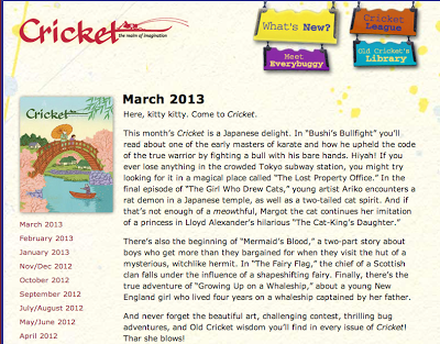 This month my poem in the voice of a bicultural girl, "What They Call Me," is featured in the March 2013 edition of Cricket Magazine, a magazine for kids. Also in this issue is part 1 of the short story by Marji Napper, "The Lost Property Office," which was featured in the Tomo: Friendship Through Fiction anthology that I edited. This issue of Cricket Magazine is focused on Japan, "a Japanese delight" say the editors, so if you can get your hands on a copy, have a look!