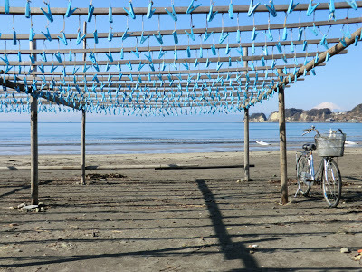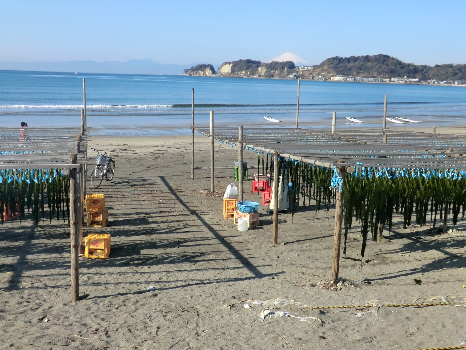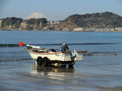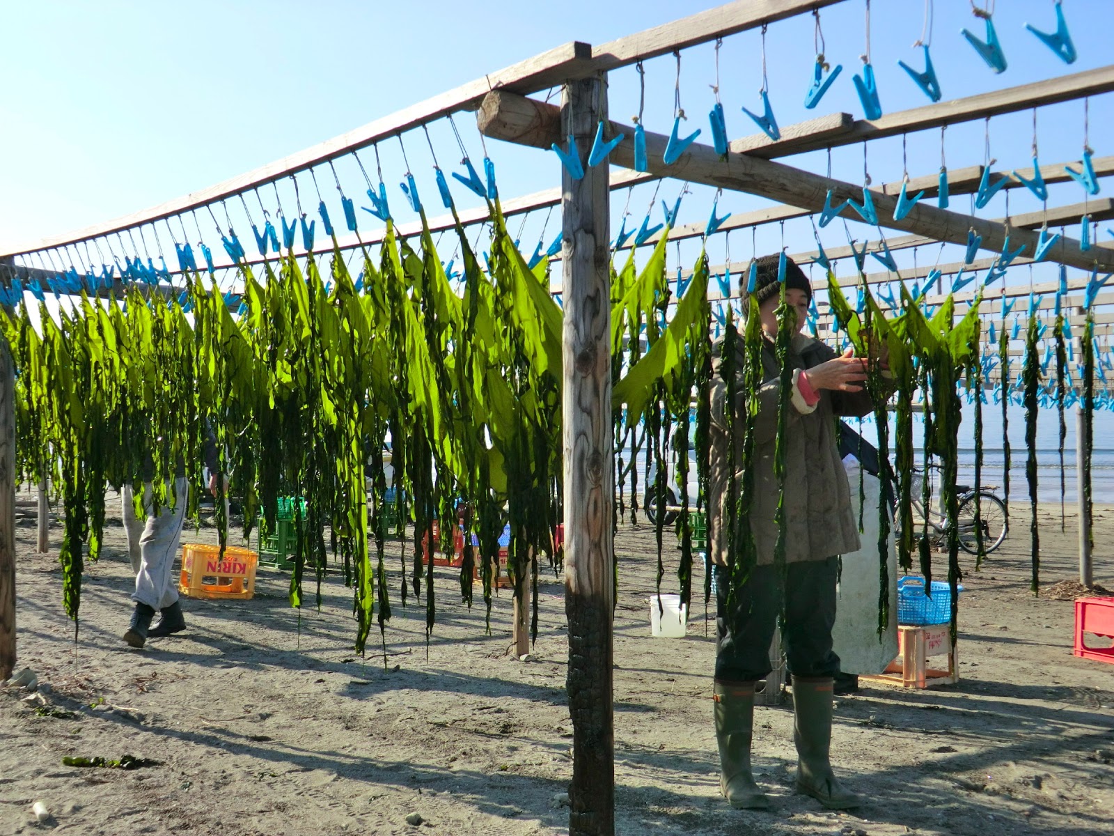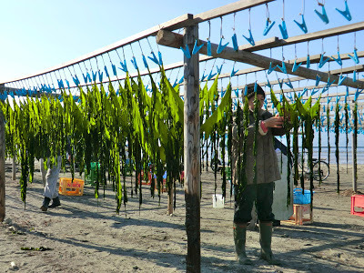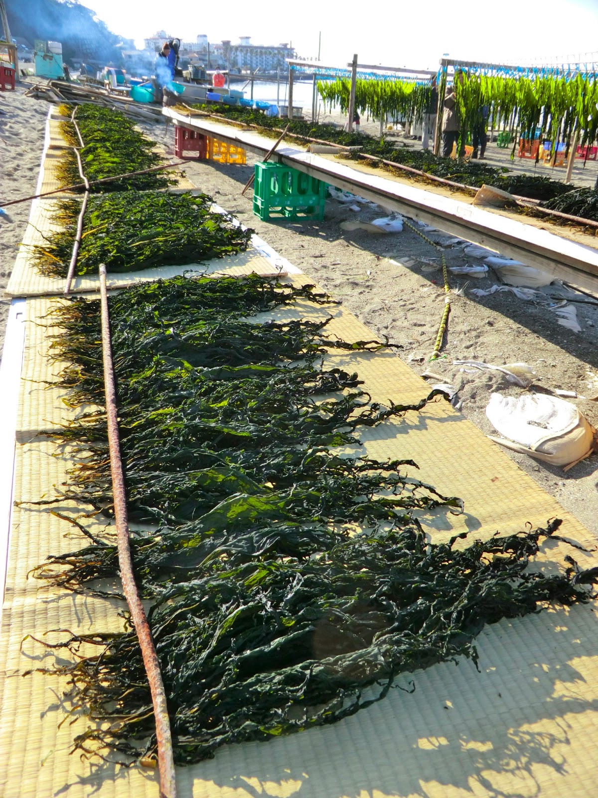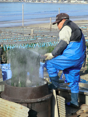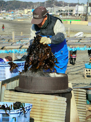 This week the wakame harvest began in Kamakura under perfect sunny skies. At last, early on Wednesday morning, I had a brief window of time to hit the beach . . . just as the wakame boats were being hauled up onto the sand. The wood fires were burning, the water was boiling, the clothes pins were dangling--all was ready. I love the whole scene.