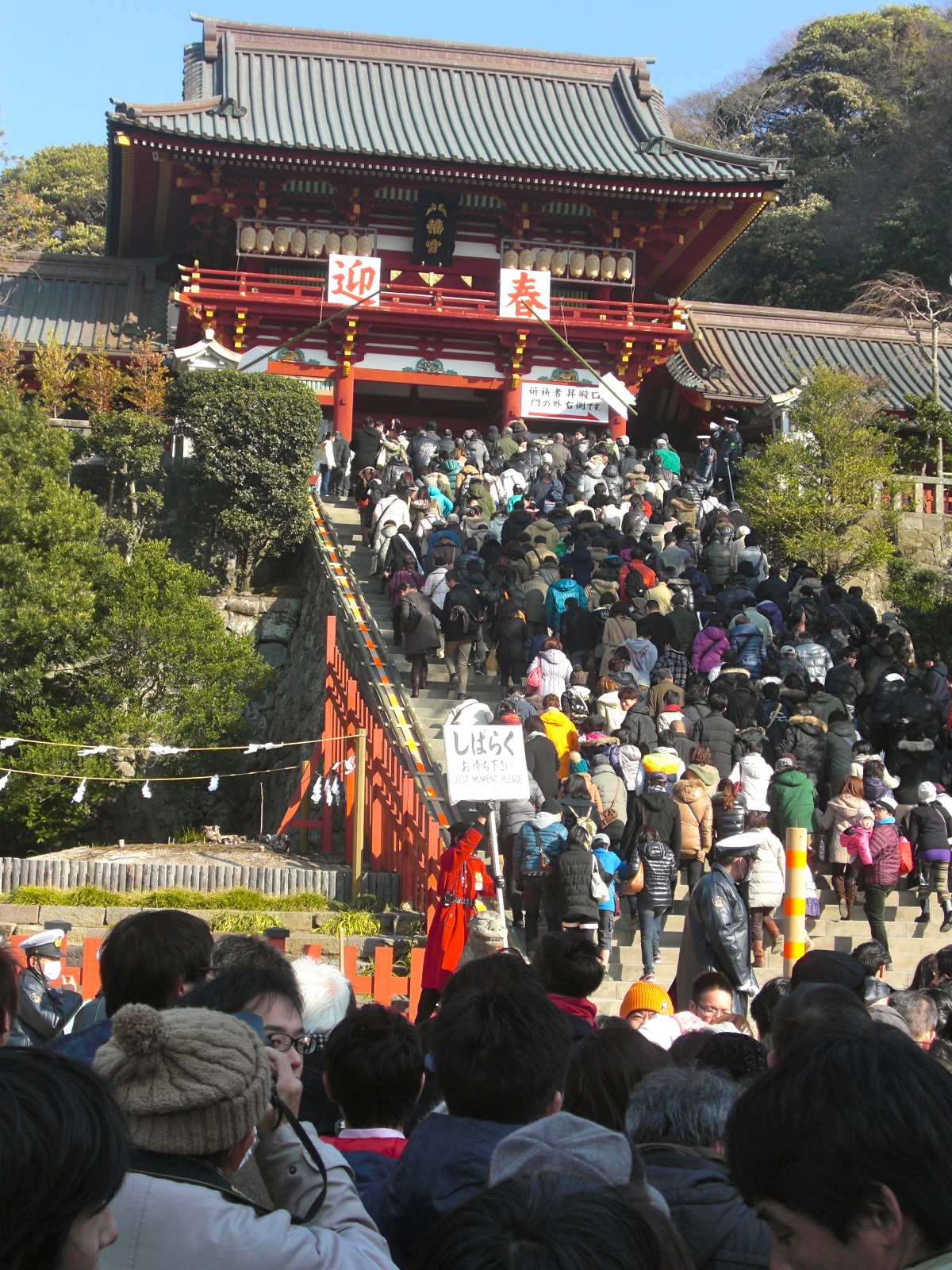 crowds climbing the stairs to Hachimangu