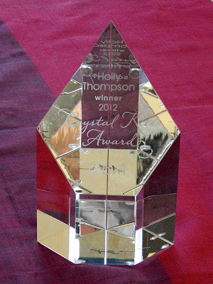 The Crystal Kite award is indeed crystal and comes with its own set of white gloves for handling. Now to find a a nice, low, earthquake-stable location for displaying it!