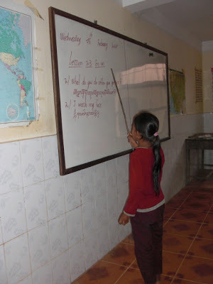 The teachers there teach following their teacher role models--as heads of the classroom, pointing to words on the whiteboard. The children take turns with the pointer reciting the sentence example.