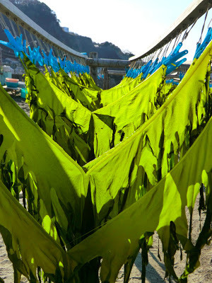 I bought a nice bag full of just boiled wakame and enjoyed a huge serving with ponzu for lunch.And today, I brought fresh wakame to Tokyo International School where I was talking about The Wakame Gatherers to elementary school students. At the end of my presentations on wakame cultivation, harvesting, boiling and drying the kids sampled the wakame . . . and came back for seconds and thirds. The plates were empty after each session. There is nothing quite like freshly harvested wakame--crunchy taste of the sea.
