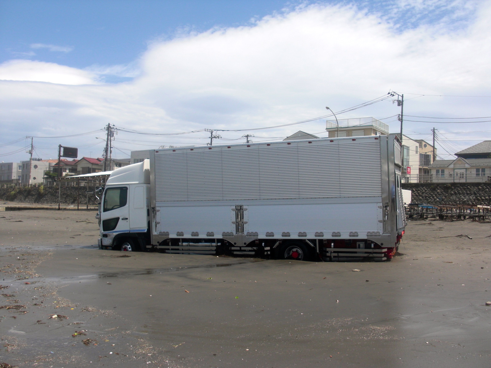 There was major damage to many of the umi no ie. Heaps of seaweed, construction materials and debris lie everywhere, and there is much clean-up work to do before reconstruction can begin. Hmm, perhaps it's time for the city to rethink this idea of building, even on a temporary basis, directly on the beach.One truck driver had clearly picked the wrong time and place to make a delivery or pick-up--apparently during the typhoon.