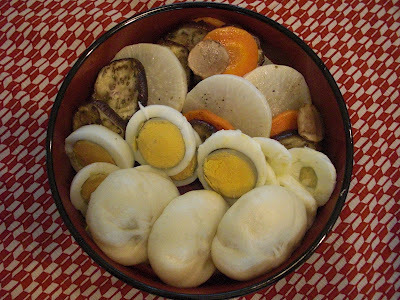 nikuman steamed buns, hard-boiled eggs and grilled vegetables...