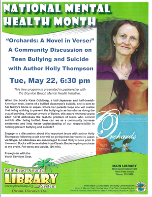 On May 22 I will be presenting to adults and teens via Skype from here in Japan at the Palm Beach County Library in Florida for National Mental Health Month. I'll be focusing on Orchards and the tough topics the novel raises on teen bullying and suicide. This is a free program but you need to preregister; details are here. If you're in Florida please help spread the word!
