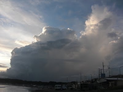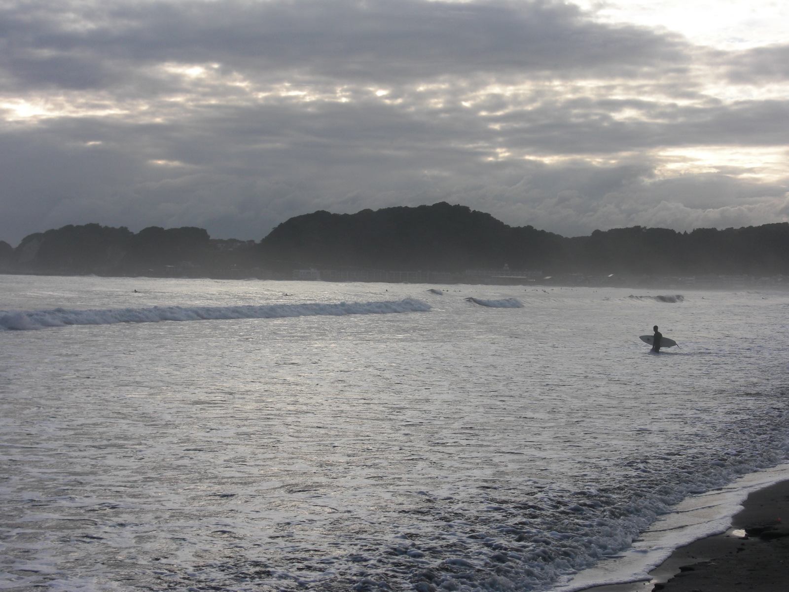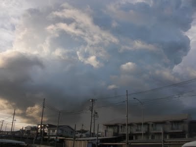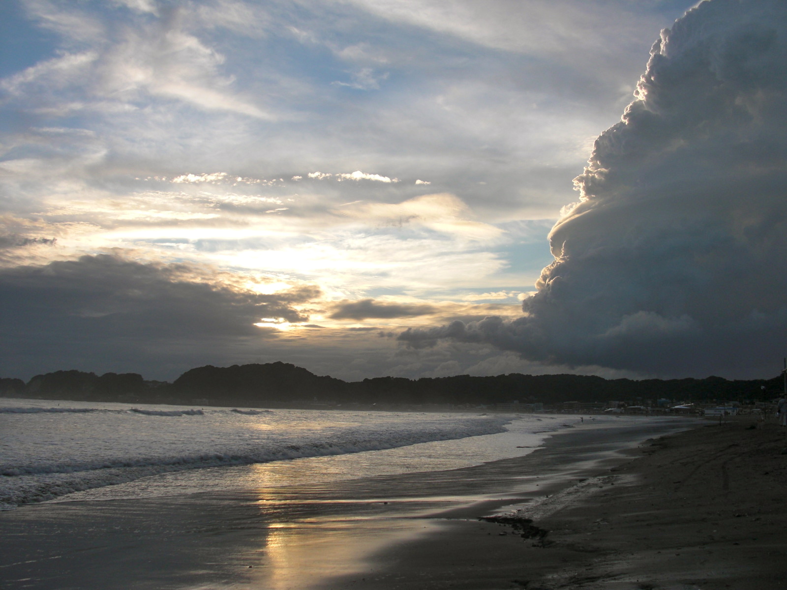 Typhoon number 12, or Typhoon Talas, is headed straight for central Japan. I cycled down to the beach in Kamakura just before sunset to check out the wave and cloud action. The tide was nearly high, and waves were surging up to the lifeguard stations and flooding into the beach road underpasses. People were scurrying about securing boats, fishing equipment and beach restaurant paraphernalia.