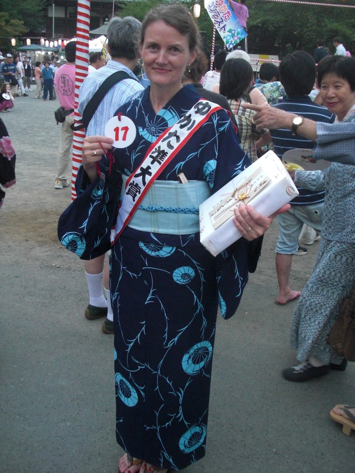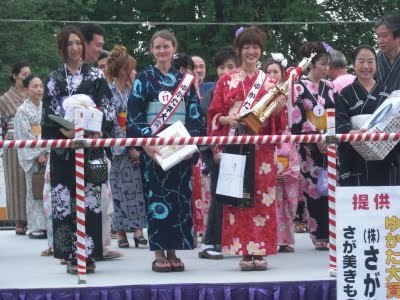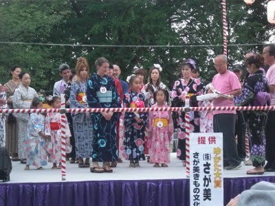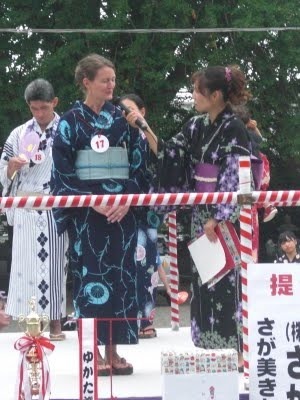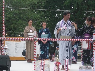 Up on stage, contestants were asked questions--details about their yukata and obi. I had practiced a few responses, and fortunately they didn't throw me any tough questions.