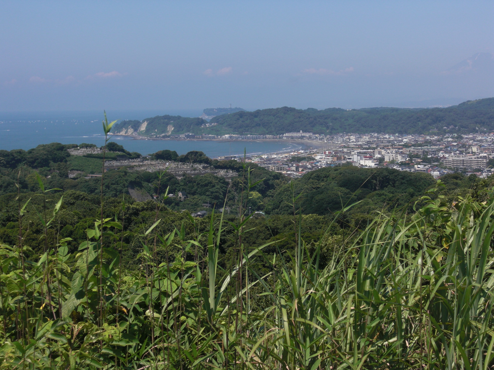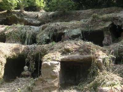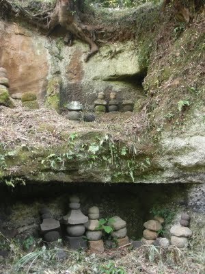 Kamakura has hiking trails winding all through its hills. Midsummer they are cool and serene, quiet save for cicadas and bush warblers. The hills climb fast to panoramic vistas and long ridges that skirt finger-like valleys. After rains the forests are lush. Ferns are hip high. Fan palms hide the trail. And here and there are caves, tiny shrines, rows of tombstones—marks of history. Worn stones reveal where others have stepped…for centuries. One of the paths I walk leads past the Takatoki hara-kiri caves. Another goes by Mandara-do with its multi-storied cave tombs. Kamakura has hundreds of burial caves from the Kamakura era dug into cliffsides. Many are filled with gorinto, stupas of five-element "rings" representing from bottom to top earth, water, fire, wind, space. There are still paths I haven't explored in all these years in Kamakura, and even on the paths I've hiked many times, I'm always discovering something I hadn't noticed before. This summer I am exploring the trails. Between writing and editing, I am taking to the hills. Some days are for running, some days are for beach walks, but other days I need a hike.