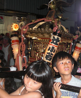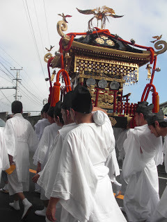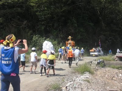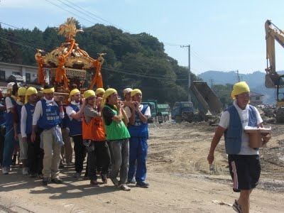 and the mikoshi (portable shrine) was brought out and carried through the harbor rubble, to the few habitable homes and temporary housing for purification rites, then out to the pier followed by the elementary school students--now only nine in the area, down from 20 due to relocation after the tsunami.