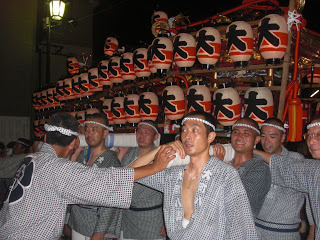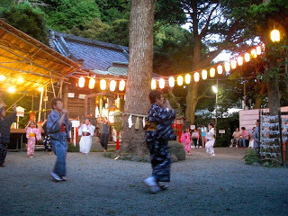 A dance group leads off Bon OdoriIn the lantern- and moonlight, men and women, young children and older people, danced round and round a huge old tabu no ki tree. Just a few joined in at first, then more, and more, and more. Last year we were a trickle. This year, instead of a single ring, we were multiple rings, a neighborhood throng circling that tree.No one wanted the dances to end. Each time the music stopped there were calls for more. Round and round that great old tree, a huge circle of community seemed to be saying, "Together we can do this."