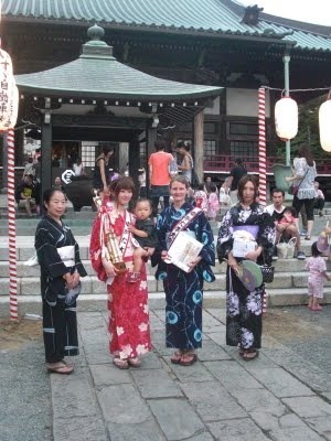 This year I joined a local dance circle, and my dance teacher cajoled me into entering a yukata contest at a big temple festival in Fujisawa. I have several ordinary yukata of my own, but members of the circle suggested one of the teacher's yukata with a willow and umbrella design. Another member loaned a linen obi. The teacher's daughter made me a hairpin with handblown glass. They helped me dress, tied the obi, put up my hair and I was ready to go.