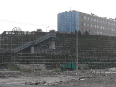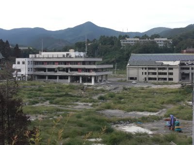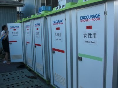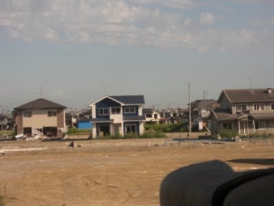 shower stallsAnd Ishinomaki itself looked quite different from the sludge shoveling days of spring. Most of the debris has been heaped into organized mountains, mud has been removed, destroyed cars have been gathered and stacked, and shells of houses stand amid cleared open areas now filling with weeds.